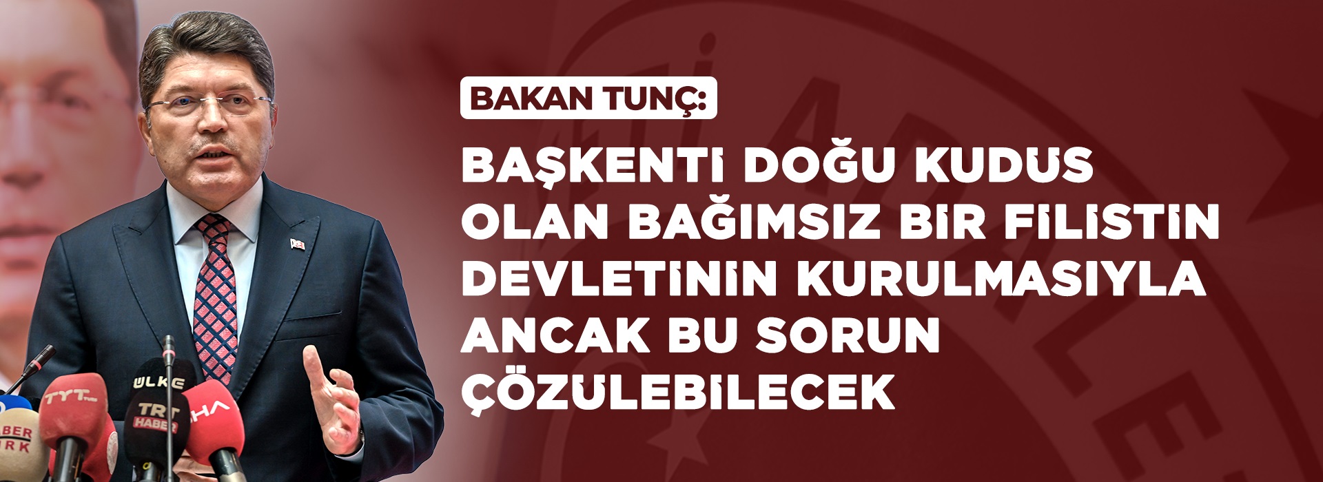 Adalet Bakanı Yılmaz Tunç, Gazze'de ateşkesin sağlanması için Türkiye'nin çok büyük gayret gösterdiğini belirterek “1967 sınırlarında toprak bütünlüğüne sahip, bağımsız, başkenti Doğu Kudüs olan bağımsız bir Filistin Devleti'nin kurulmasıyla ancak bu sorun çözülebilecek. Bu politikamızı sürdürmeye devam edeceğiz.” dedi.
