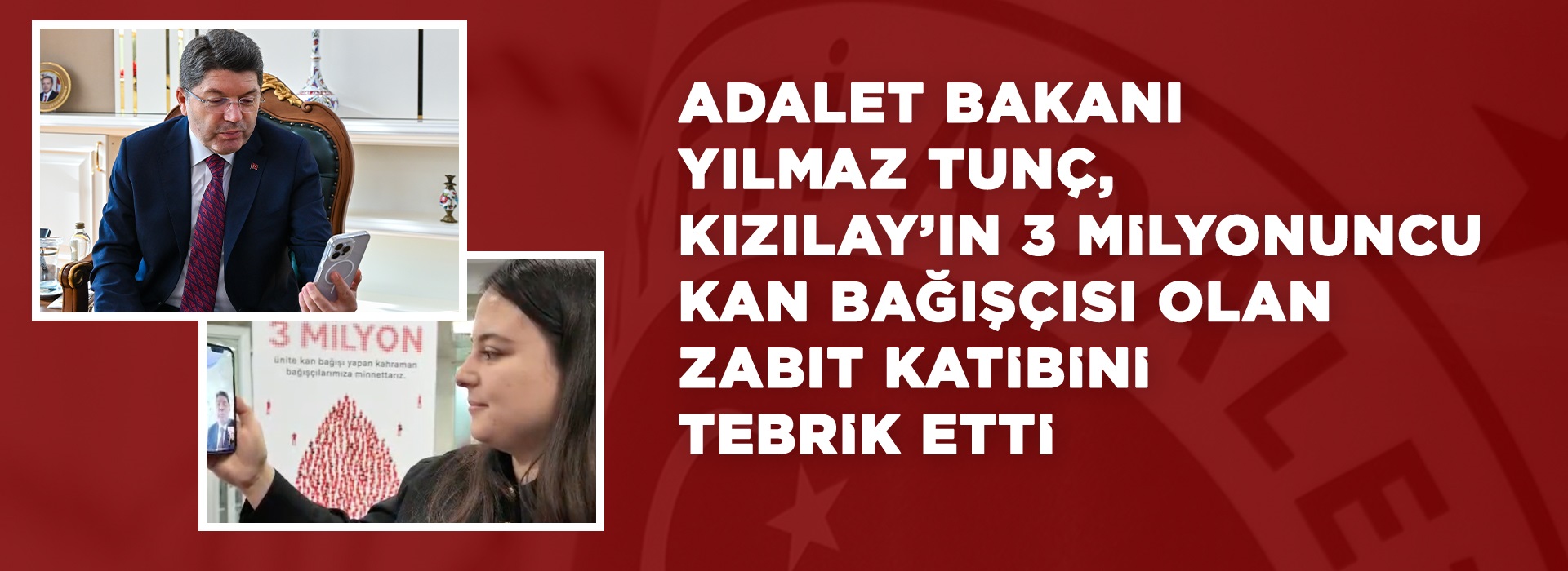 Adalet Bakanı Yılmaz Tunç, Türk Kızılay’ın, bu yıl 3 milyonuncu ünitenin kan bağışçısı olan Gaziantep Adliyesi zabıt katibi Büşra Tokgöz’u arayarak tebrik etti.