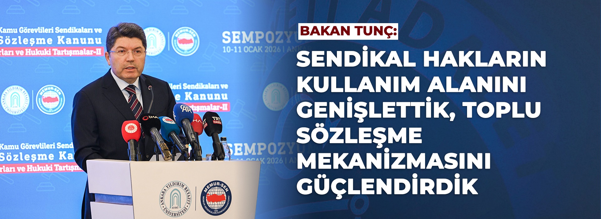 Son 23 yılda gerçekleştirdikleri reformlarla toplu sözleşme hakkını anayasal güvenceye kavuşturduklarını, sendikal örgütlenmenin önündeki idari ve fiili engelleri önemli ölçüde giderdiklerini ve sendikaya katılımı kolaylaştırdıklarını vurgulayan Bakan Tunç, "Cumhurbaşkanı'mız Sayın Recep Tayyip Erdoğan'ın liderliğinde, sendikal örgütlenmeyi idarenin takdirine bağlı bir alan olmaktan çıkararak anayasal güvenceye kavuşturduk, yargısal korumaya aldık ve idari kolaylıklarla desteklenen etkin bir hak kullanımı haline getirdik." ifadesini kullandı.
