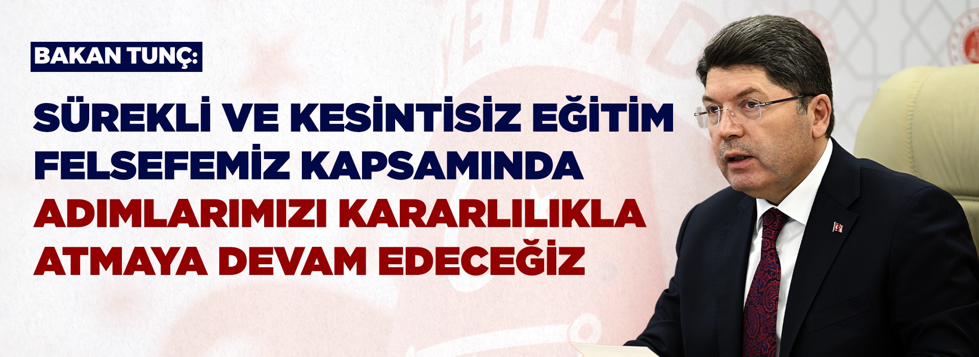 Adalet Bakanı Yılmaz Tunç, 2025'te 71 bin 178 bakanlık personeline hizmet içi eğitim verdiklerini 2026 yılında da 85 bin personele ihtiyaç duyulan konularda meslek içi eğitimler düzenleyeceklerini belirterek “Sürekli ve kesintisiz eğitim felsefemiz kapsamında adımlarımızı kararlılıkla atmaya devam edeceğiz.” dedi.