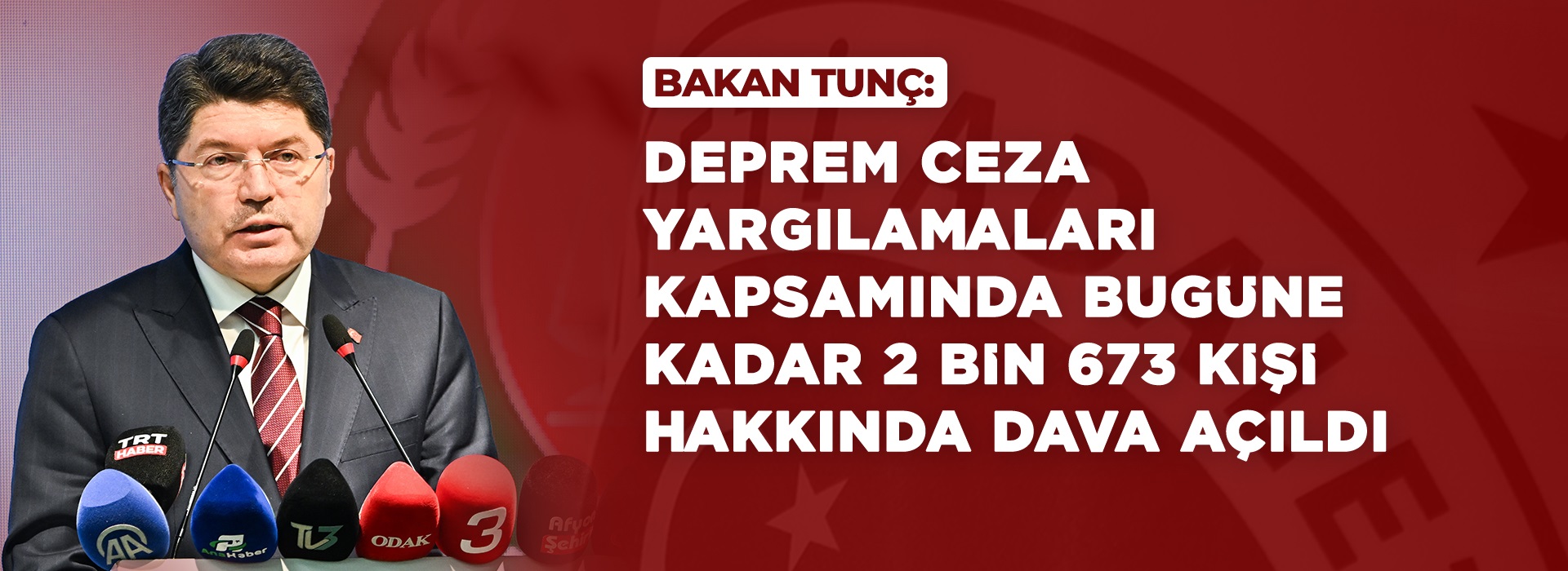 Adalet Bakanı Yılmaz Tunç, “Deprem ceza yargılamaları kapsamında bugüne kadar 2 bin 673 kişi hakkında dava açıldı. Elbette ki büyük bir afet, dünya tarihinin en büyük depremiyle karşı karşıya kaldık.” dedi.
