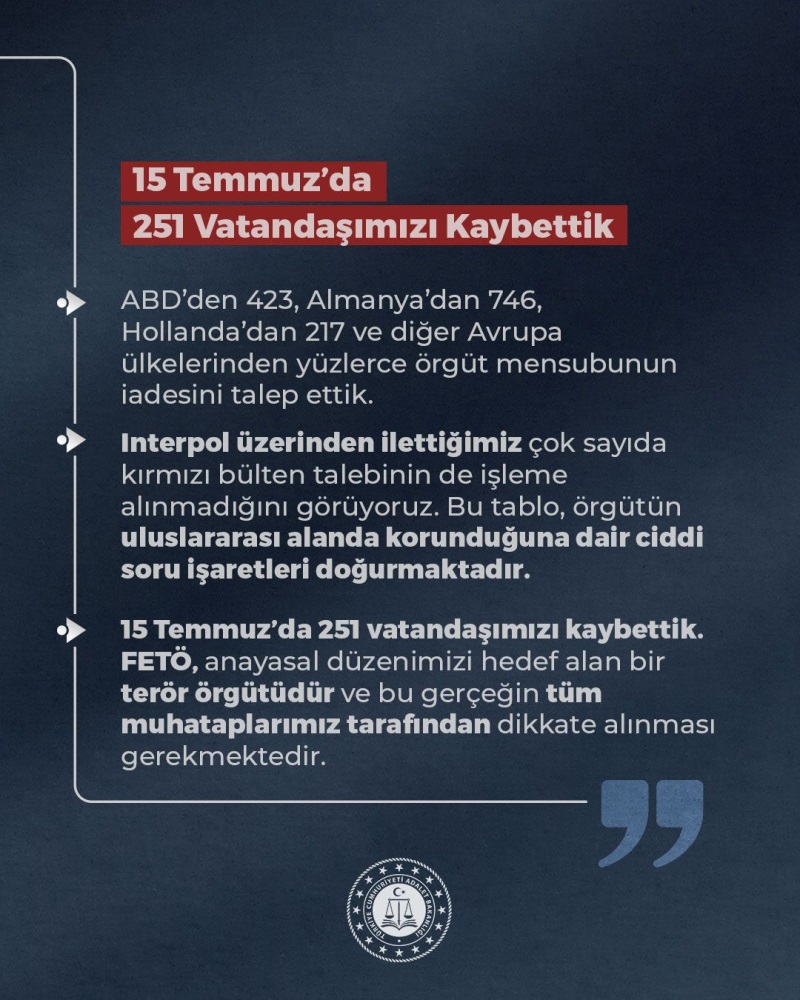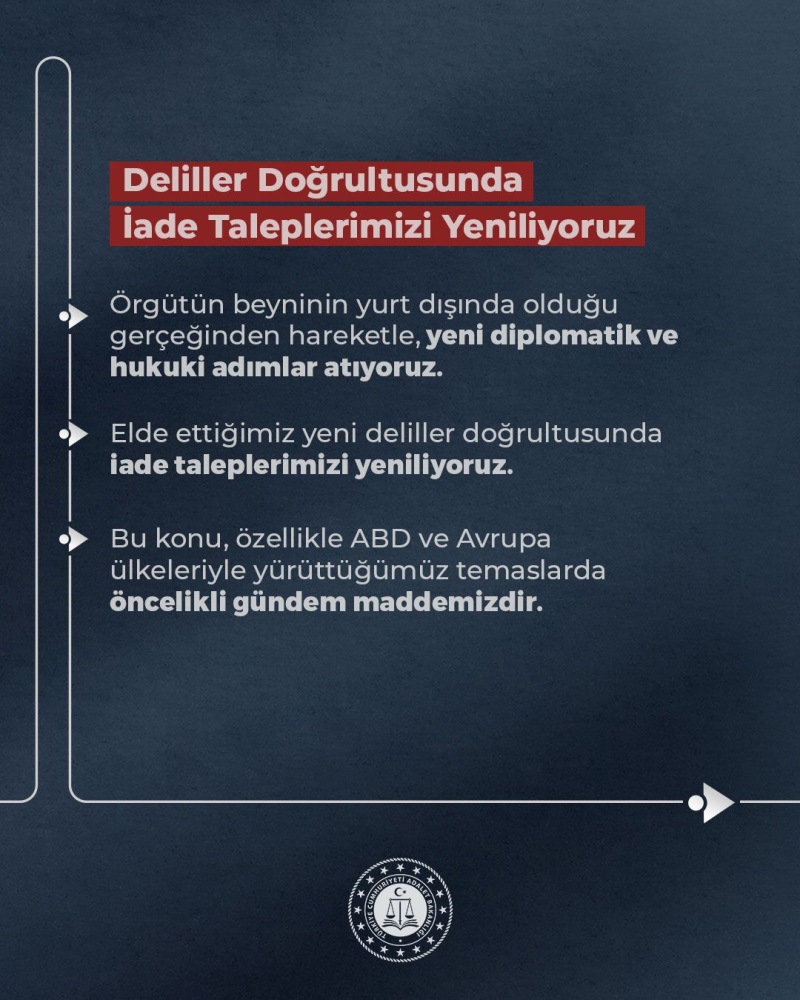 Bakan Gürlek, Adalet Bakanlığı’nın elde edilen yeni delillerle iade taleplerini yenileyeceğini ve özellikle ABD ile Avrupa ülkeleriyle yapılan görüşmelerde bu konunun öncelikli gündem maddesi olacağını ifade etti.